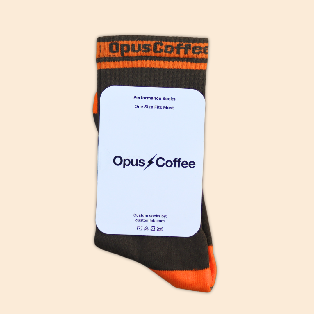 Our Opus Coffee Knit Crew Socks are the ultimate accessory for the person who loves Opus Coffee and cool footwear. They are brown with an orange design and adorned with our signature lightning bolt logo.
