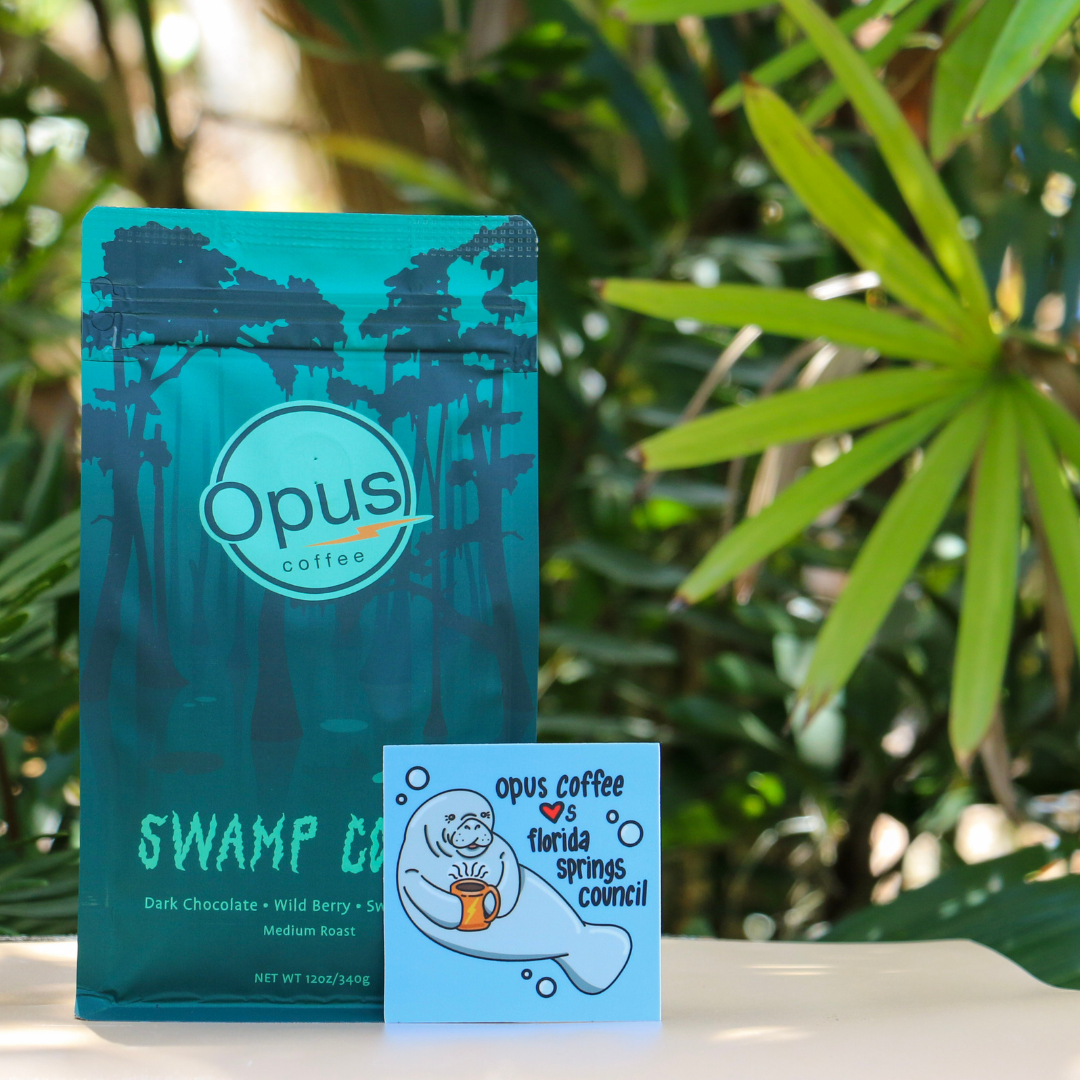 For the entire month of April 2026, Opus Coffee is making a donation to the Florida Springs Council with every purchase of the Swamp Coast Blend. Each purchase also includes a free limited-release sticker (pictured) to show off your contribution to the Florida Springs. Sticker designed by Opus Coffee’s very own Mother Gator Goods.